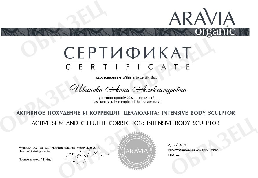 После прохождения мастер-класса участники получат информационный буклет, каталог продукции ARAVIA Organic и именной сертификат о прохождении мастер-класса (коммерческий сертификат) по теме «Активное похудение и коррекция целлюлита».