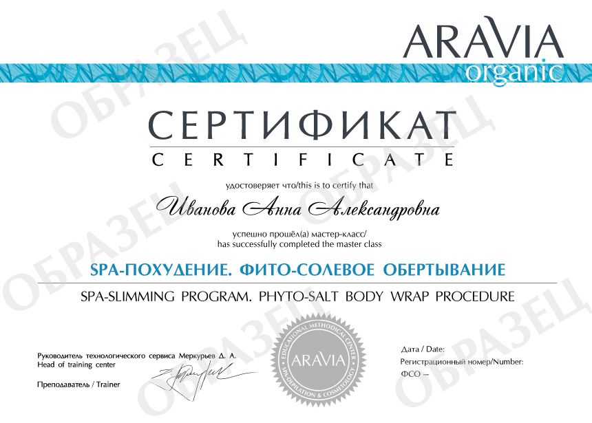 После прохождения мастер-класса участники получат каталог средств ARAVIA Organic, прайс-лист, протокол процедуры, буклет и именной сертификат о прохождении мастер-класса по теме «SPA-похудение. Фито-солевое обёртывание».